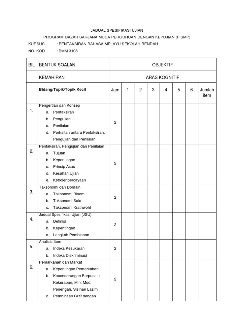 Contoh Format Jadual Spesifikasi Ujian Pdf